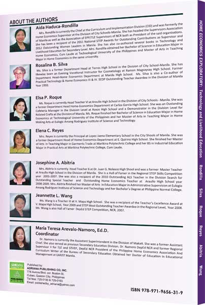 This is an exploratory book intended for Grades 7 or 8 that focuses in Home Economics area and is compliant to the K to 12 Curriculum in the Technology and Livelihood Education Program. Lessons in this book provide various assessment tools and hands-on activities as practicum to assess how far the students have acquired the necessary skills to obtain a National Certificate Level II or NCII.